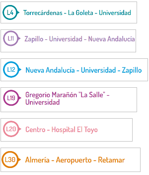 Líneas desde Granada, Sevilla, Barcelona, Murcia y Madrid Centro ciudad a 8 km., de la Universidad de Almería.